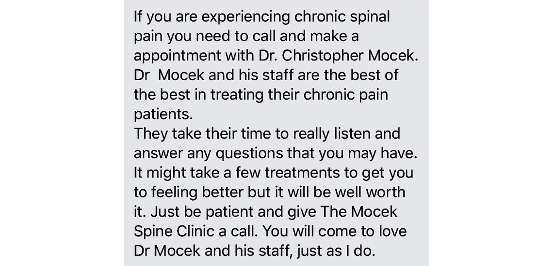 Our clinic has lost a few patients this year as we slowly taper the max opiate daily dose to a much safer level of 50 morphine equivalent dose or less. Keep in mind that the Mocek Spine Clinic...